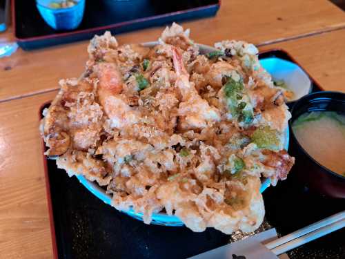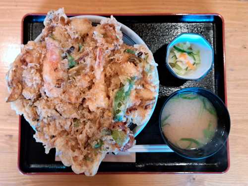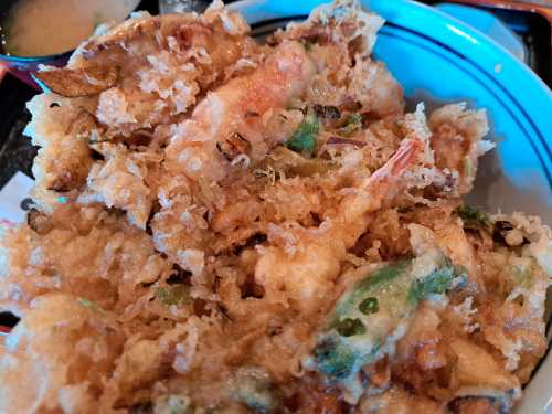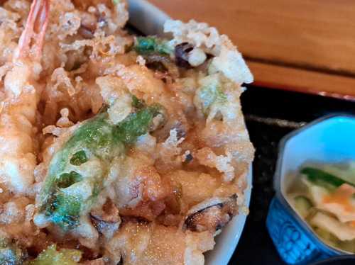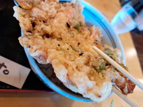 どんぶりから かき揚げがはみ出てます!