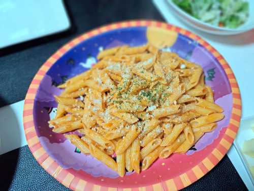 ペンネも茹でました。ミートソースで味付け